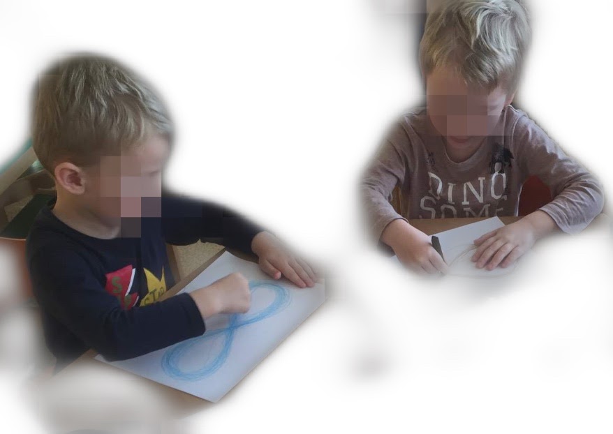 Popis cviku: Tužkou nakreslíme ležatou osmičku. Děti tuto osmičku zpočátku obtahují a to směrem od středu doleva nahoru, ruce mohou střídat bez ohledu na dominantní ruku. Později osmičku obtahují oběma rukama současně. Postupujeme od největší ležaté osmičky ve vzduchu, před sebou, nad sebou, nad zemí, k menší. Důležitá je zraková kontrola. Tužkou nebo fixem nakreslíme co největší ležatou osmičku na papír A3 nebo A4 . Čím větší osmičku můžeme namalovat, tím lépe; při individuální práci využijeme tabuli. Při cvičení neskláníme hlavu, sledujeme očima celý pohyb.