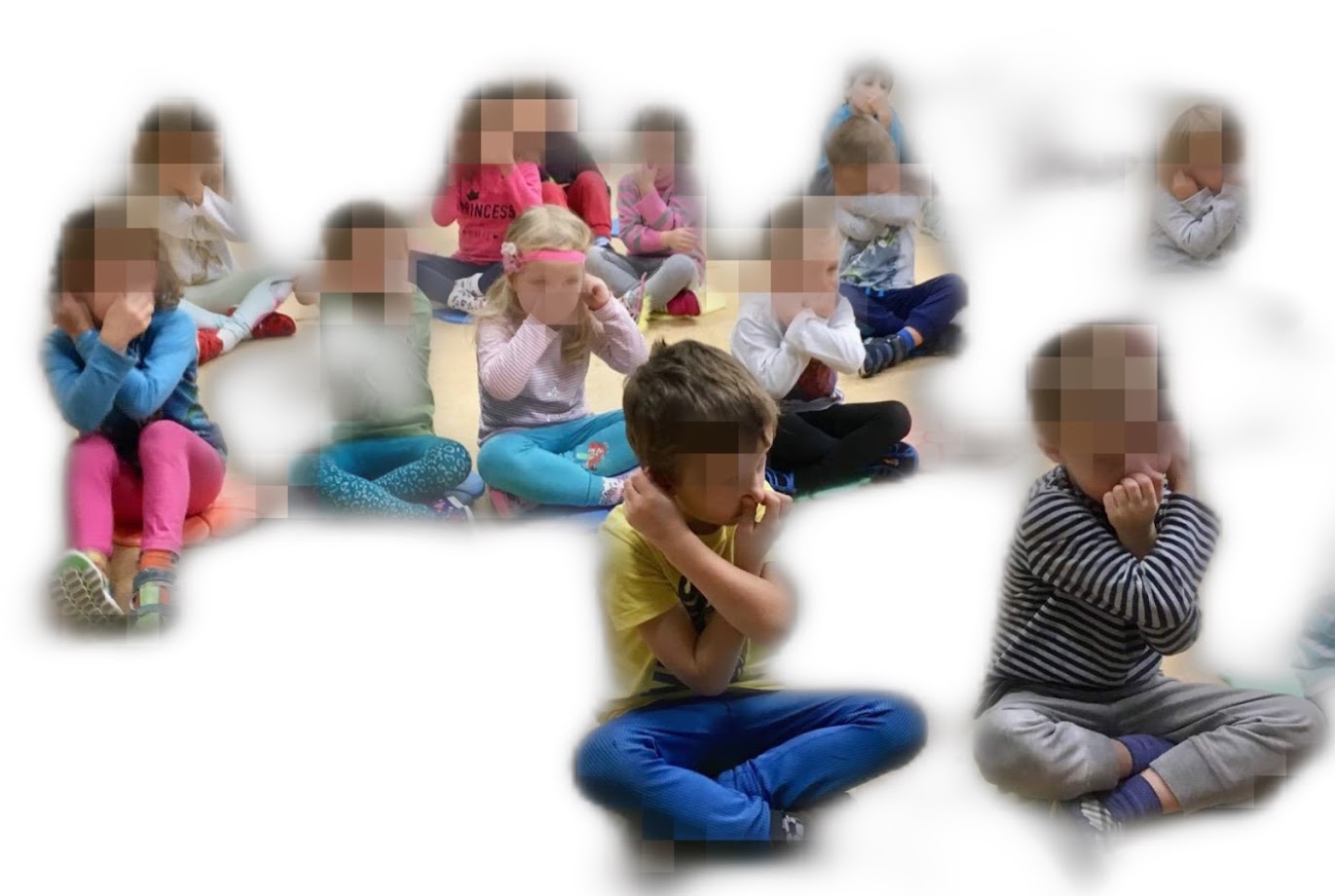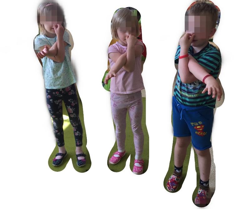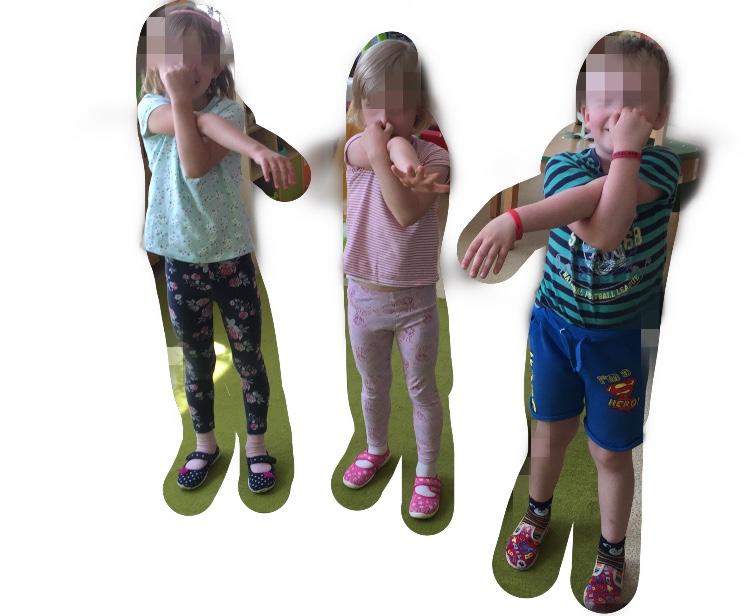 Popis cviku: Cvik provádíme ve stoje nebo v sedě. Dáváme ruce střídavě pravá / levá do pozice 1. Sloního chobotu - jedna ruka natažená a druhá drží nos. 2. Obě ruce křížem na ramena a složitější varianta je obě ruce křížem každá na ucho. 3. Jedna ruka drží nos a druhá ucho. Pohyb můžeme provádět s hudbou nebo rytmicky s rozbalením rukou před sebe dlaněmi vzhůru. Obměnit a ztížit cvik je možno tak, že při pohybu dítě sleduje jeden nepohybující se předmět, bod, oči.